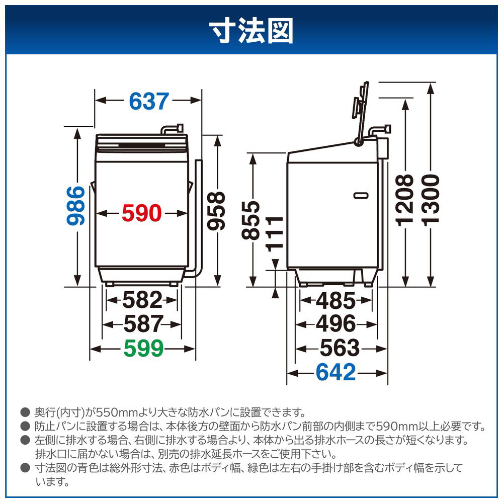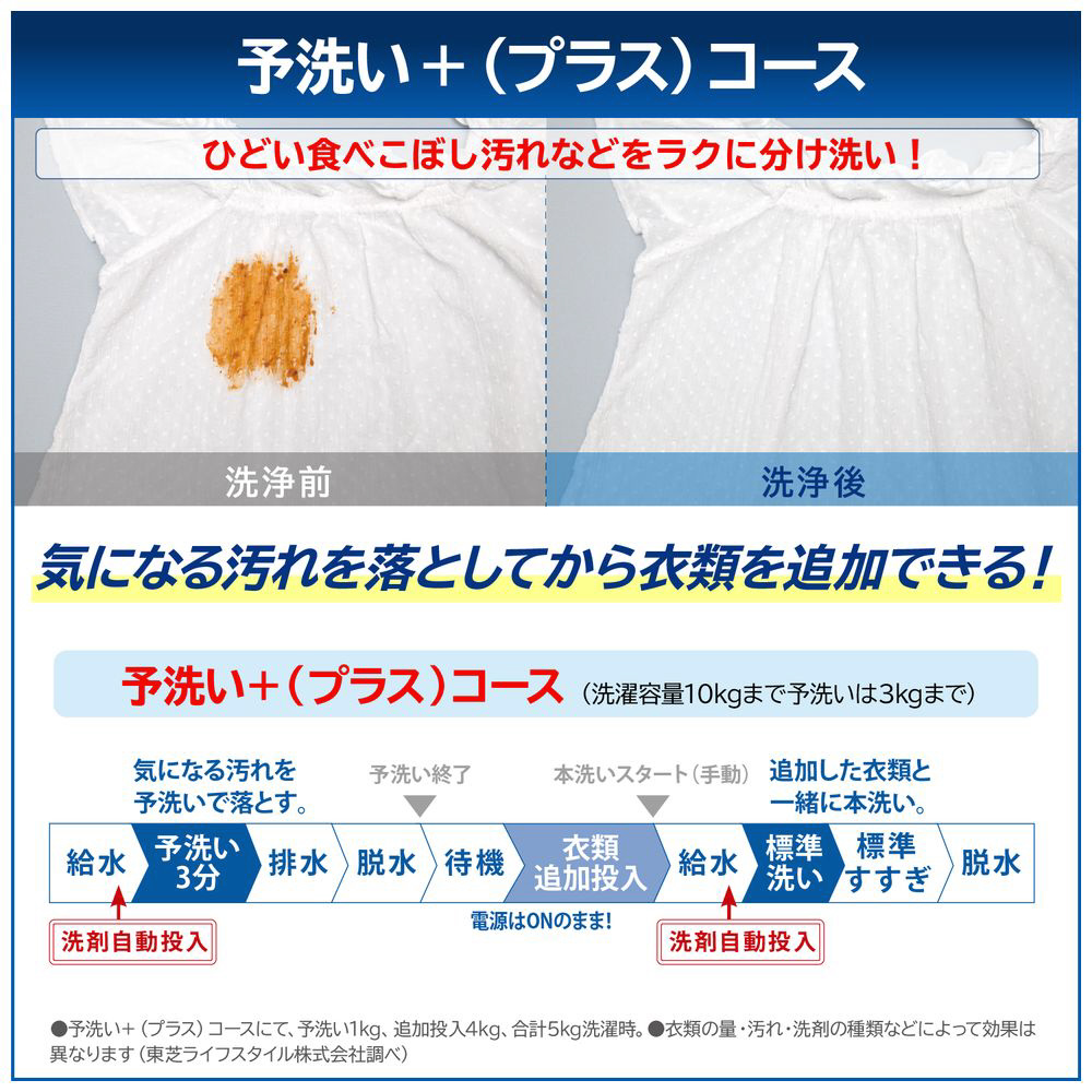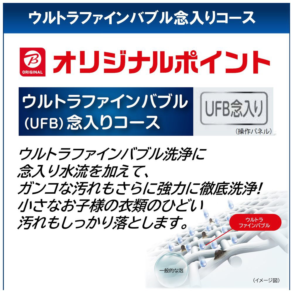 | コース | ウルトラファインバブル念入り、メモリー(10kg)、つけおき(6kg)、スピード、部屋干し(5kg)、毛布(4.7kg)、自動2度洗い(がんこ汚れモード)、おしゃれ着、香るおしゃれ着(3kg) |