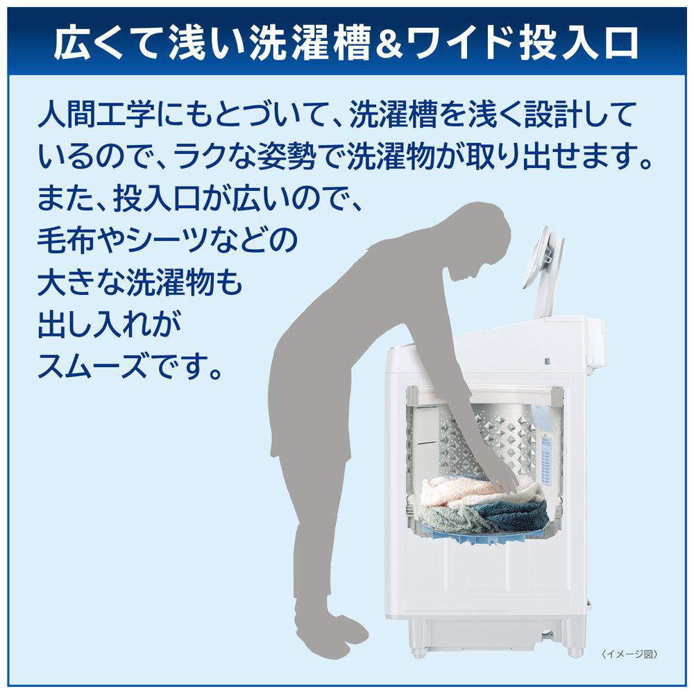 人間工学にもとづいて、洗濯槽を浅く設計しているので、身体に負担をかけずに、槽の底や奧の衣類までラクに手が届きます。