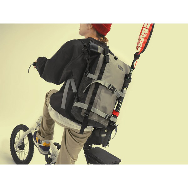 雨や泥に強いターポリン素材の防水ストレージに、オートバイで運びにくい釣竿や三脚、トレッキングポール等の「長物」を確実に積載できるように縦横合計4本のベルトを装備。