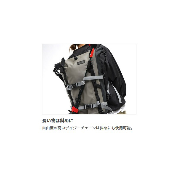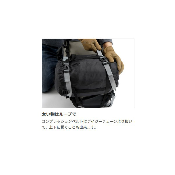 トレッキングポール等の長物や、寝袋、テントなどを固定できる様に、縦2本のデイジーチェーンと横2本のコンプレッションベルト、4本の固定用ループを採用しています。