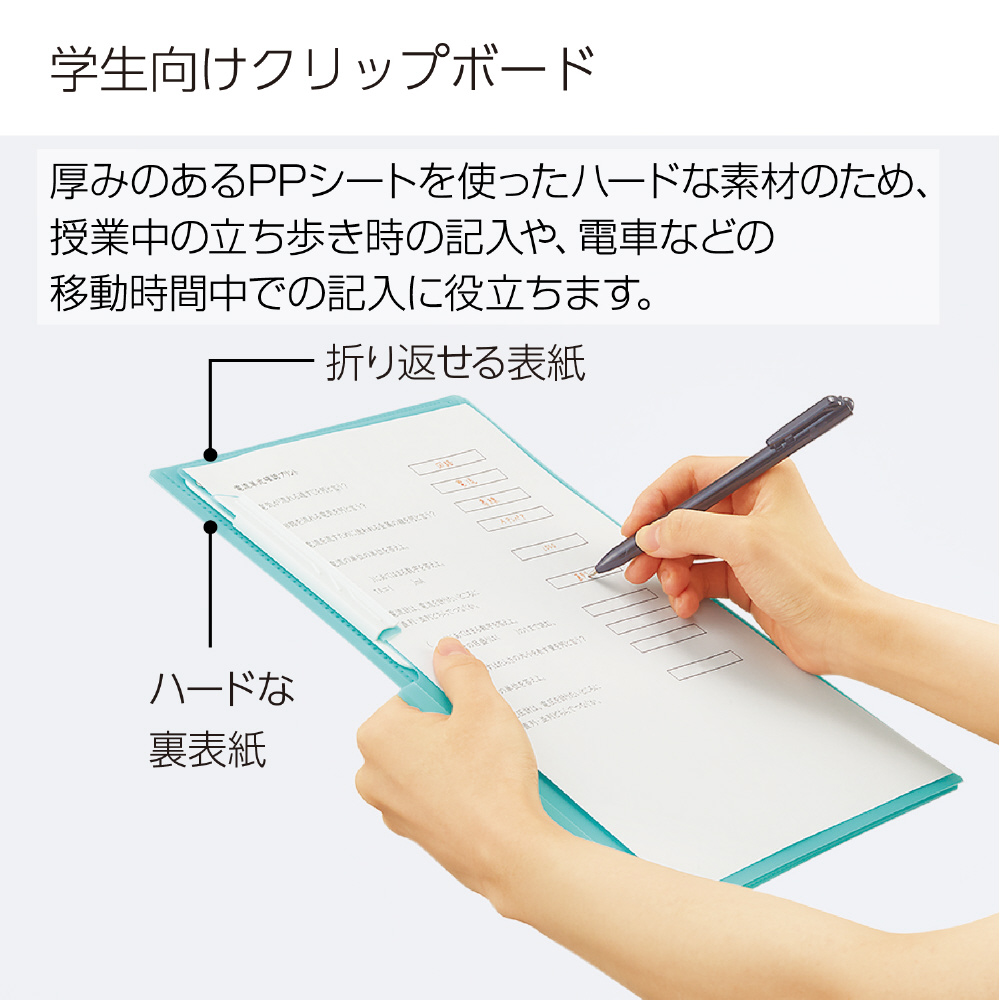 ●ハードな素材なので、机の上が狭いときにはクリップボードとして使える。