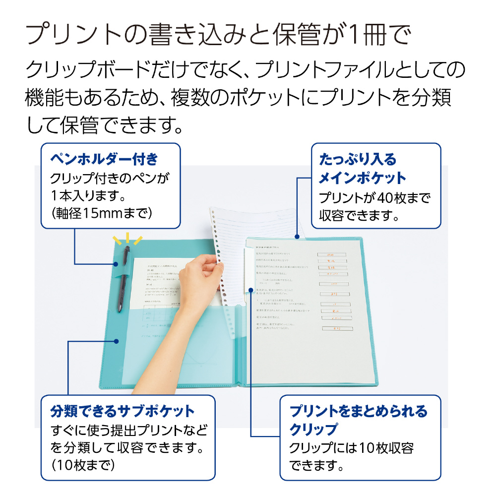 ●クリップ/書き込みしたいプリントをとじられるクリップ(プリント10枚まで収容)。