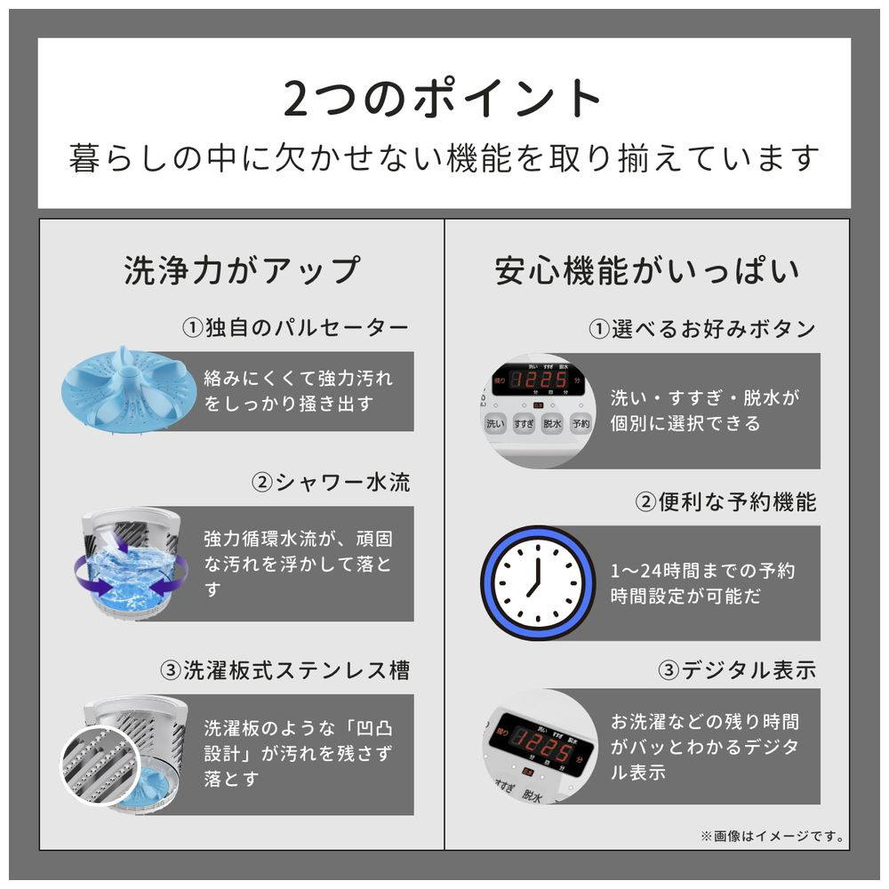 | 仕様1 | 標準水位: 57〜20L 最短洗濯時間: 約9分(水位20L時) 予約タイマー: 1〜24時間(1時間単位) 排水方向: 左右、後、真下 |