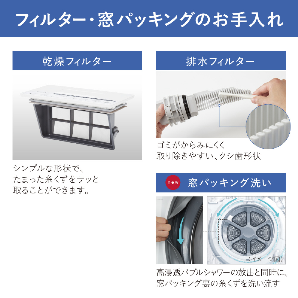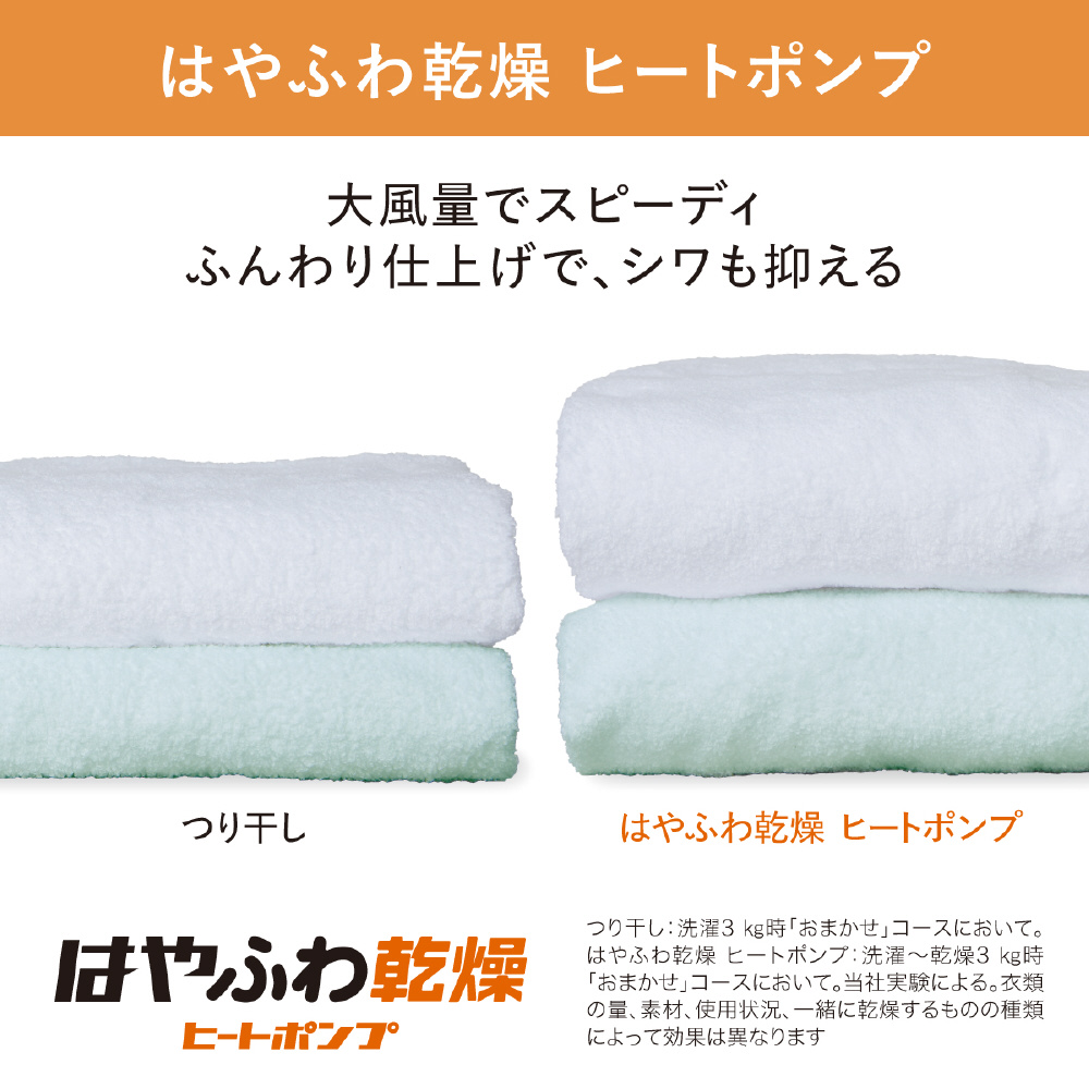 濃密泡と高浸透バブルシャワーで繊維の奥の汚れを落とす「スゴ落ち泡洗浄」、大風量でスピーディ、ふんわり仕上げでシワを抑える「はやふわ乾燥」を搭載した大容量12kgモデル。