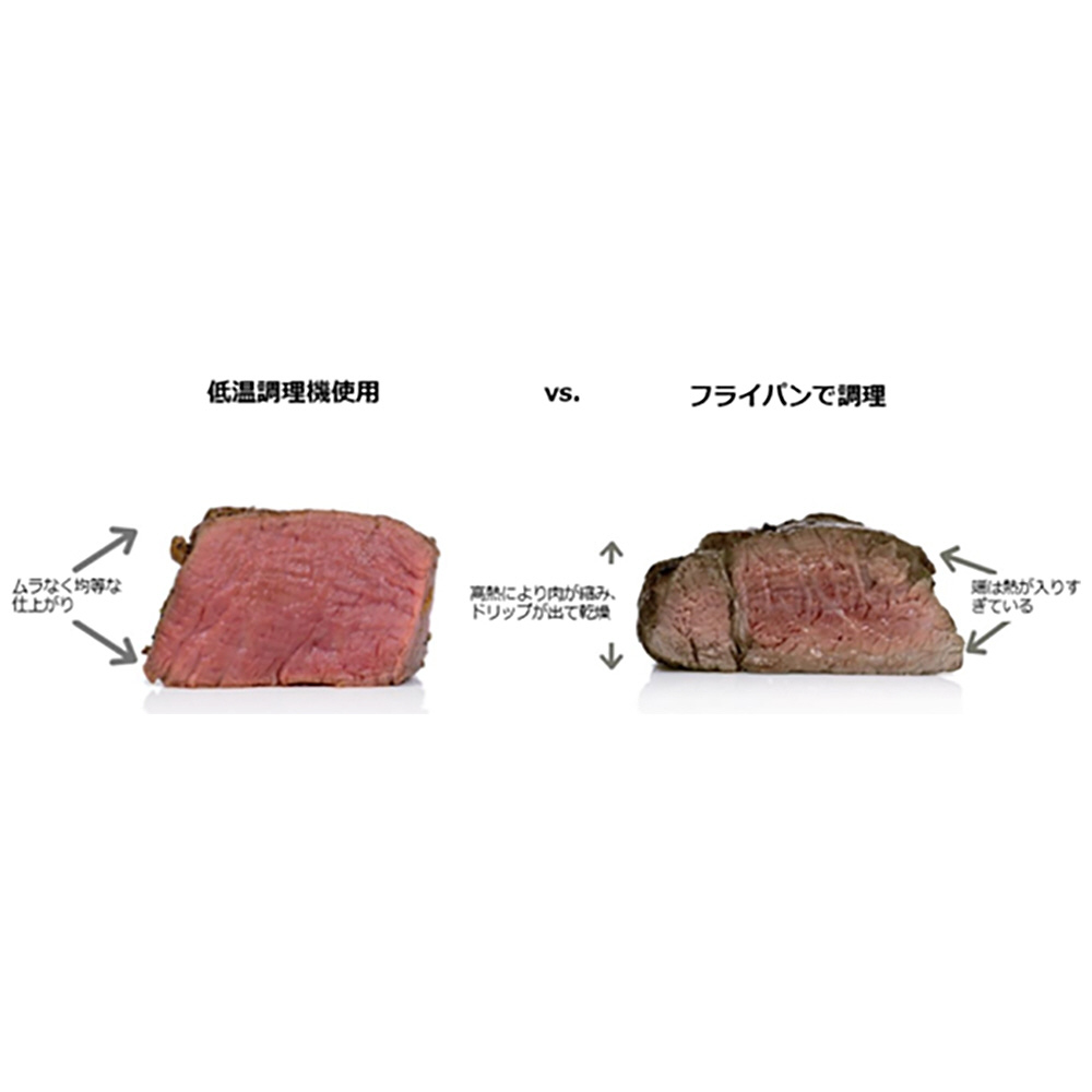 フライパン調理の場合、高熱によりお肉が傷み、ドリップ(肉汁)が大量に出て乾燥してしまったり、端に熱が入りすぎてしまい、硬くなったり味を損なう原因に。低温調理器なら、適温での調理でドリップを防ぎ、ムラなく均等に仕上がり、しっとりジューシーに。