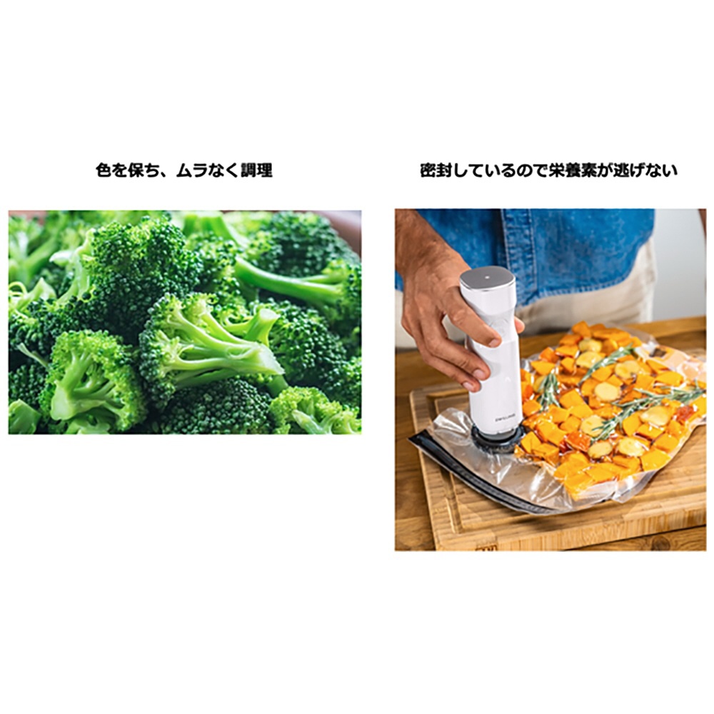 低温調理をさらに美味しく仕上げるためには、真空状態に近づけることが大切です。真空パックにはフレッシュ&セーブの自動ポンプとバッグが便利。バッグから空気を抜くことで、食材が鍋で浮かず、均等に熱が伝わります。更に調理後に真空保存すれば、食材最大5倍長持ち。作り置きや、残ったおかずも最後までおいしく保存。低温調理だけでなく、お料理好きには欠かせないアイテムです。