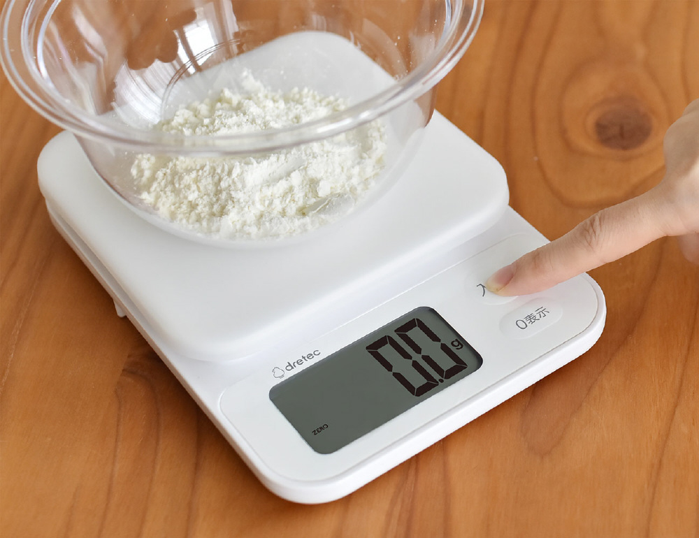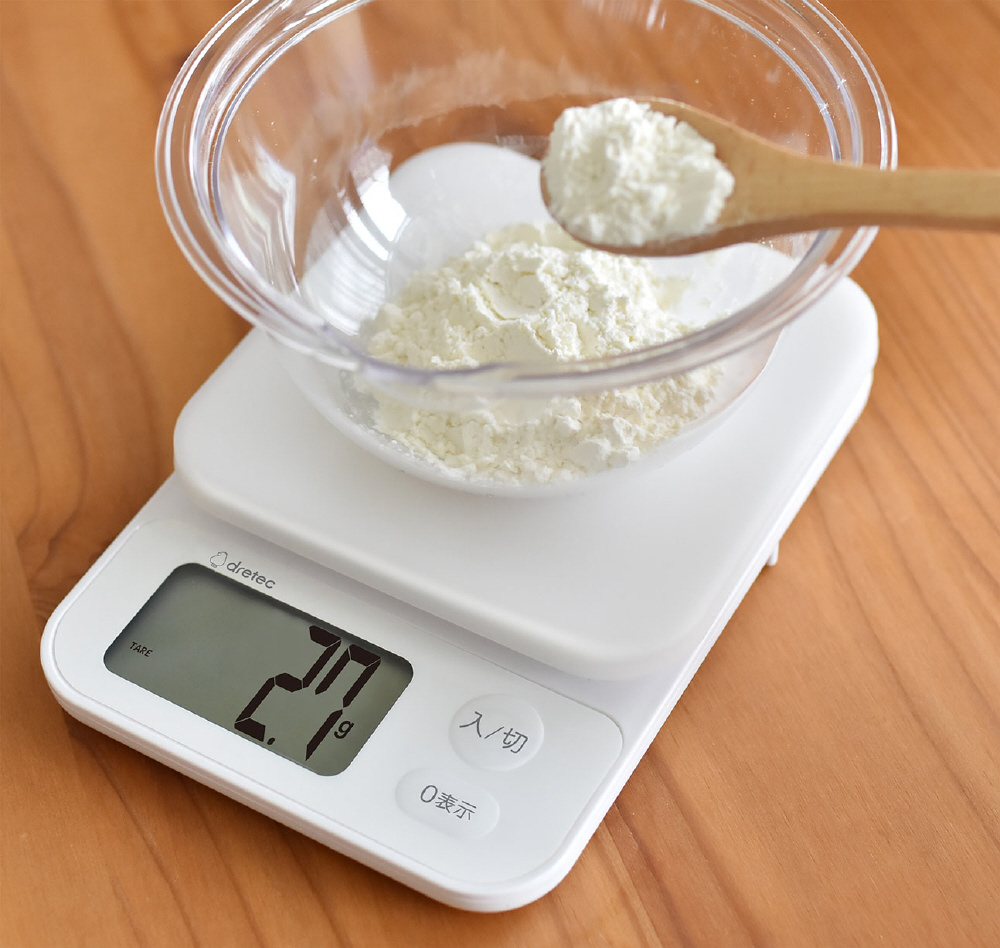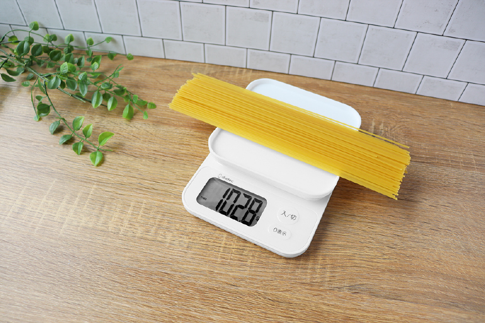 表示が見やすい大画面(約66×33mm)タイプのデジタルキッチンスケール。最大2kg、最小表示0.1g単位ではかれます(2000gまで)。
