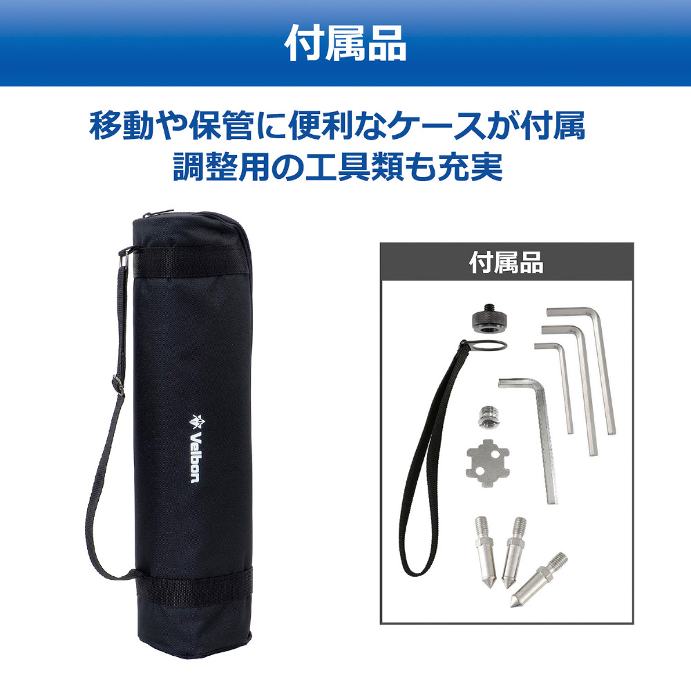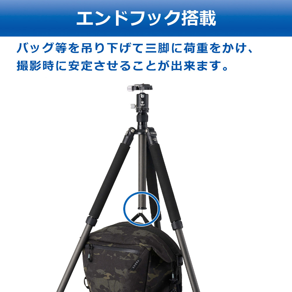 軽量で操作性の良いナットロック式カーボン脚を採用。新デザインで握りやすくスムーズにロック・解除が可能です。脚部は1本を取り外して一脚にすることができます。