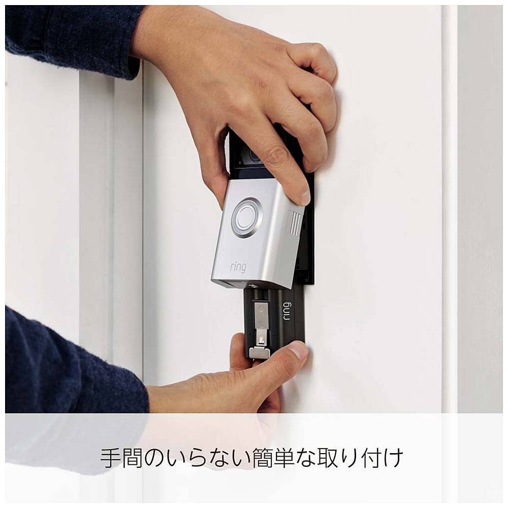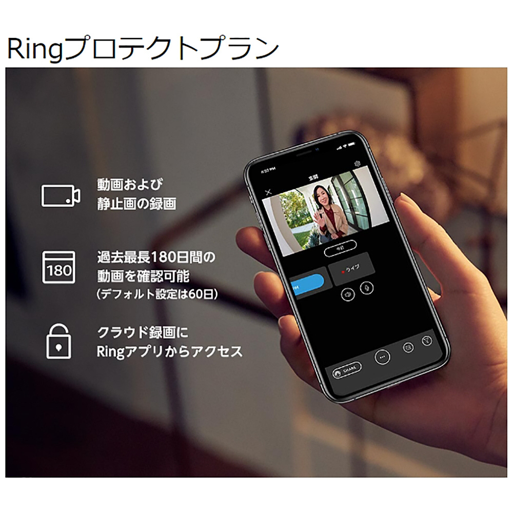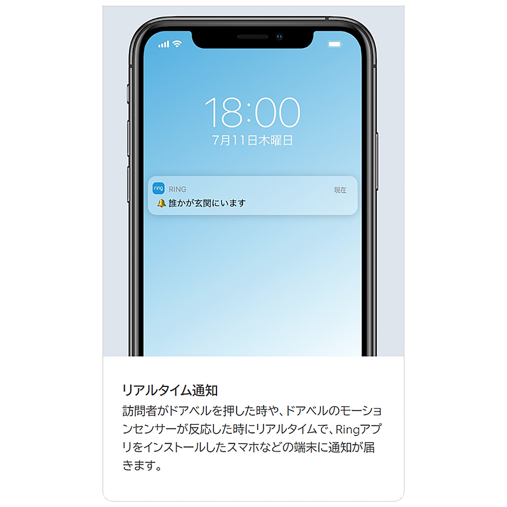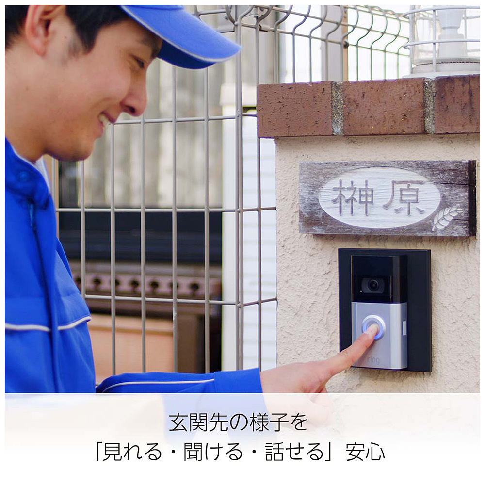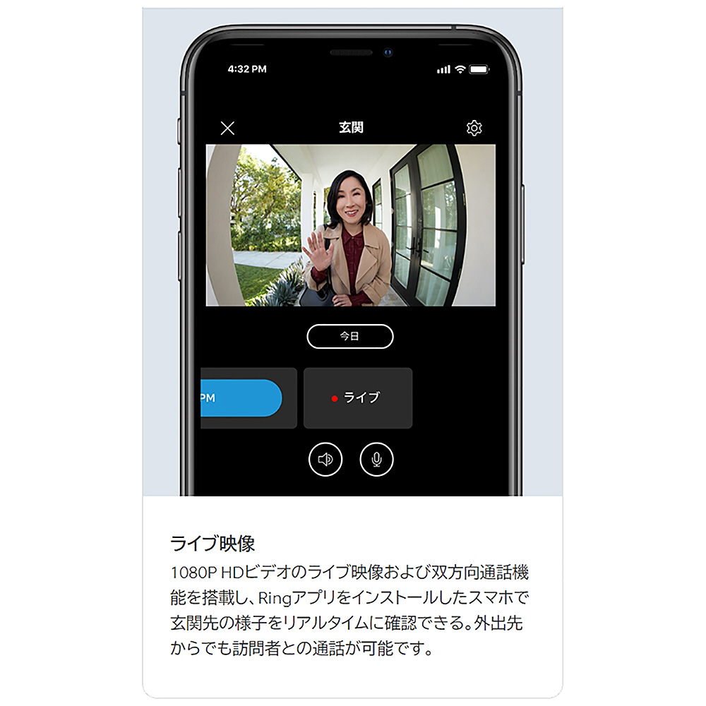1080p HDビデオのライブ映像および双方向通話機能を搭載し、Ringアプリをインストールしたスマホで玄関先の様子をリアルタイムに確認できます。外出先からでも訪問者との通話が可能です。