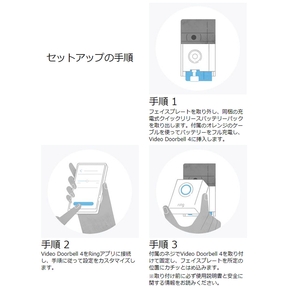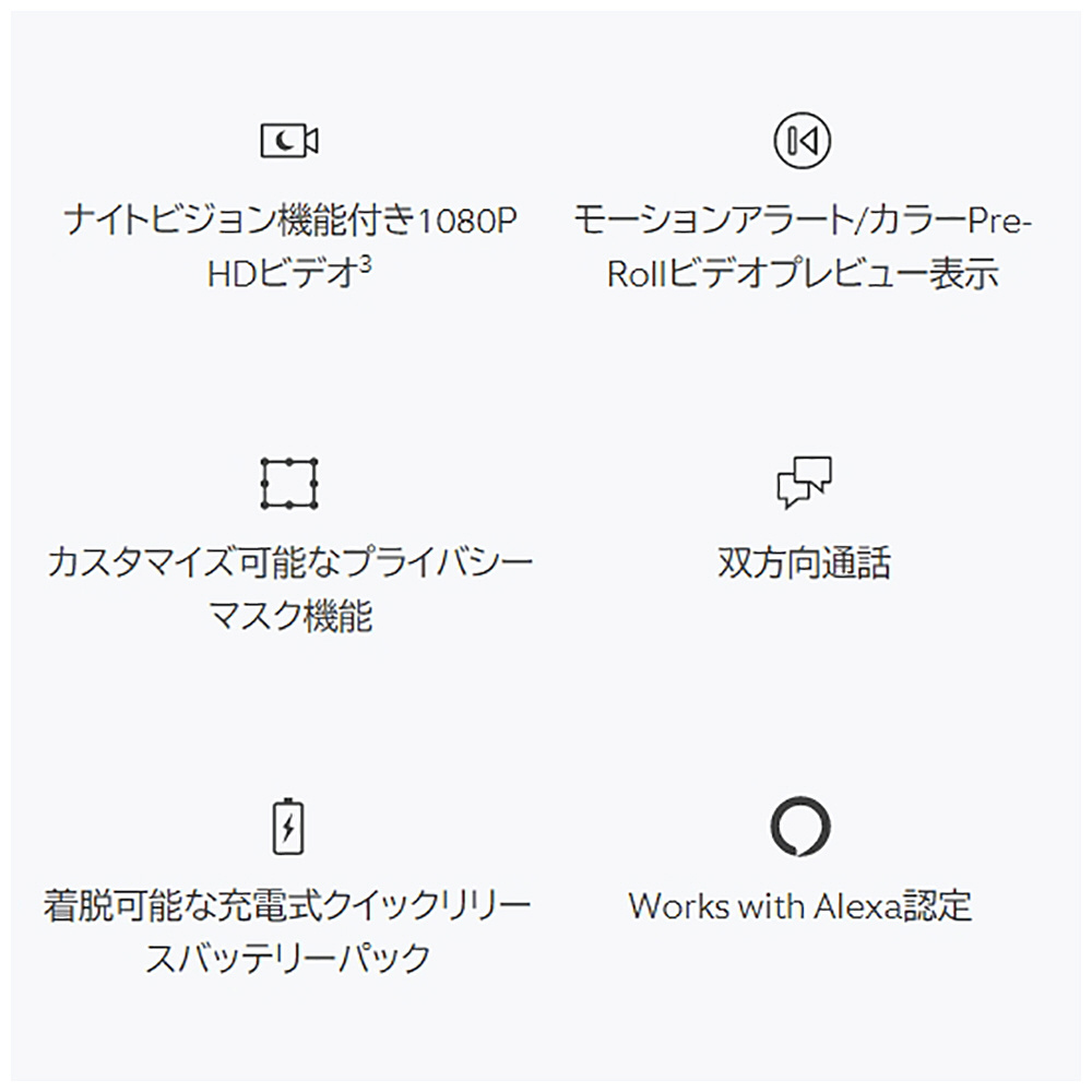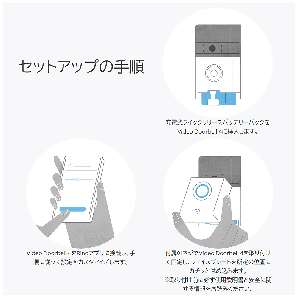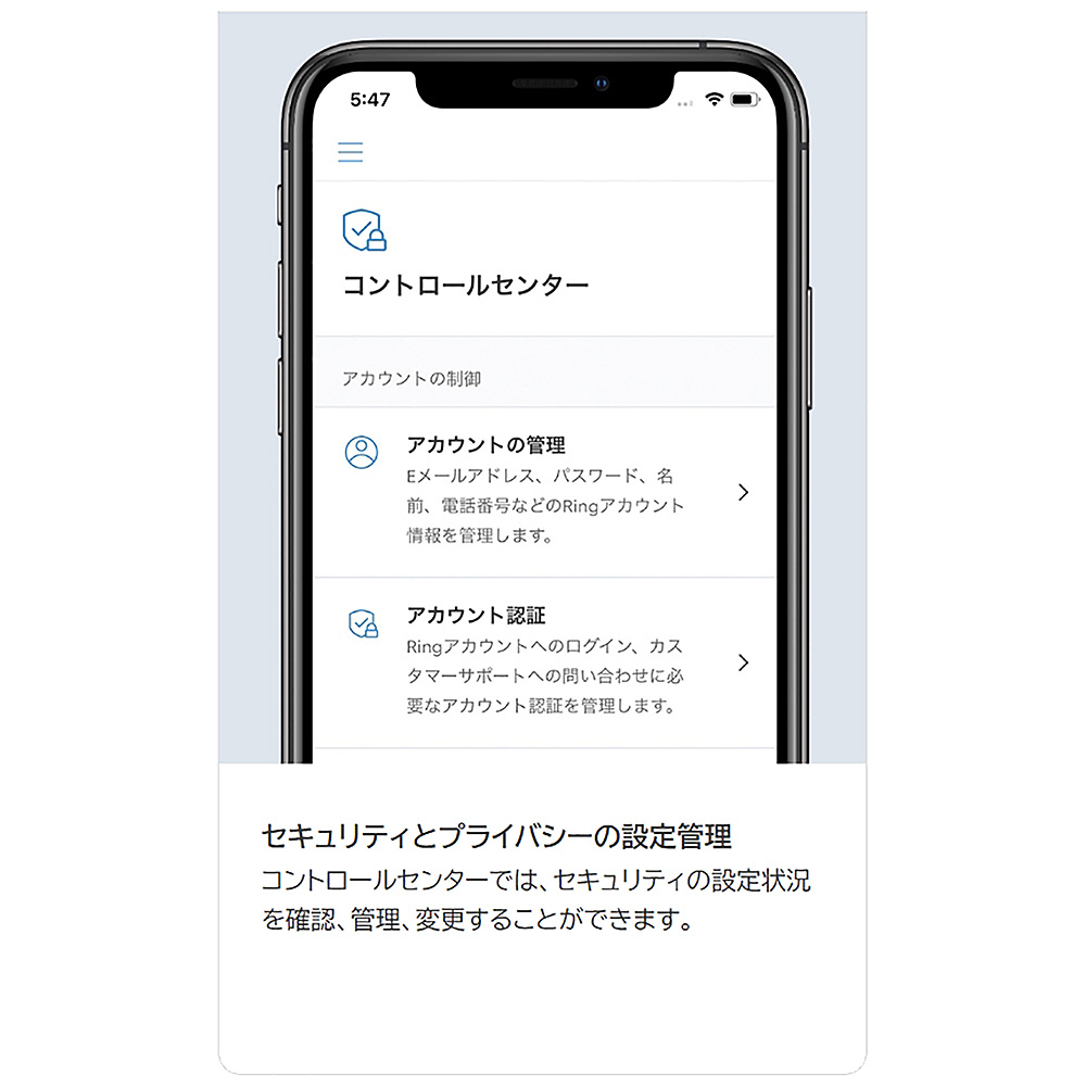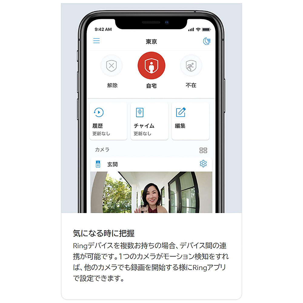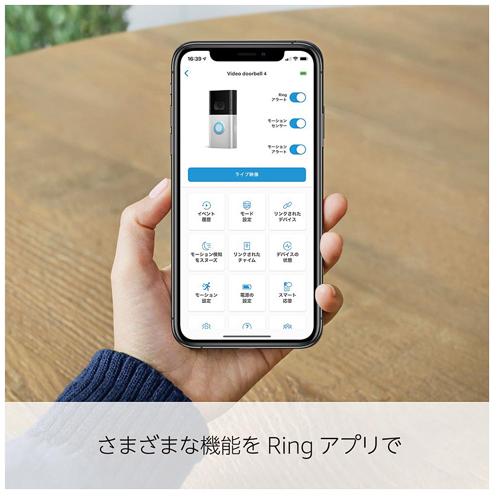 1080p HDビデオのライブ映像および双方向通話機能を搭載し、Ringアプリをインストールしたスマホで玄関先の様子をリアルタイムに確認できます。外出先からでも訪問者との通話が可能です。