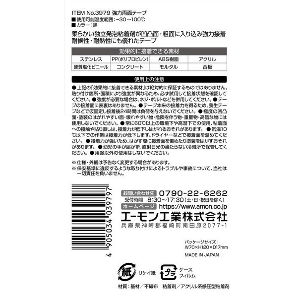 | 商品名 | 3979 強力両面テープ 多用途 黒色 サイズ:幅10mm×長さ1m×厚さ1mm 3979 |