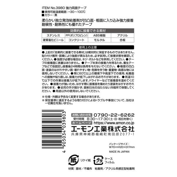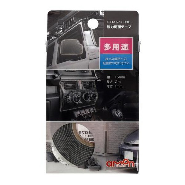 | 商品名 | 3980 強力両面テープ 多用途 黒色 サイズ:幅15mm×長さ2m×厚さ1mm 3980 |