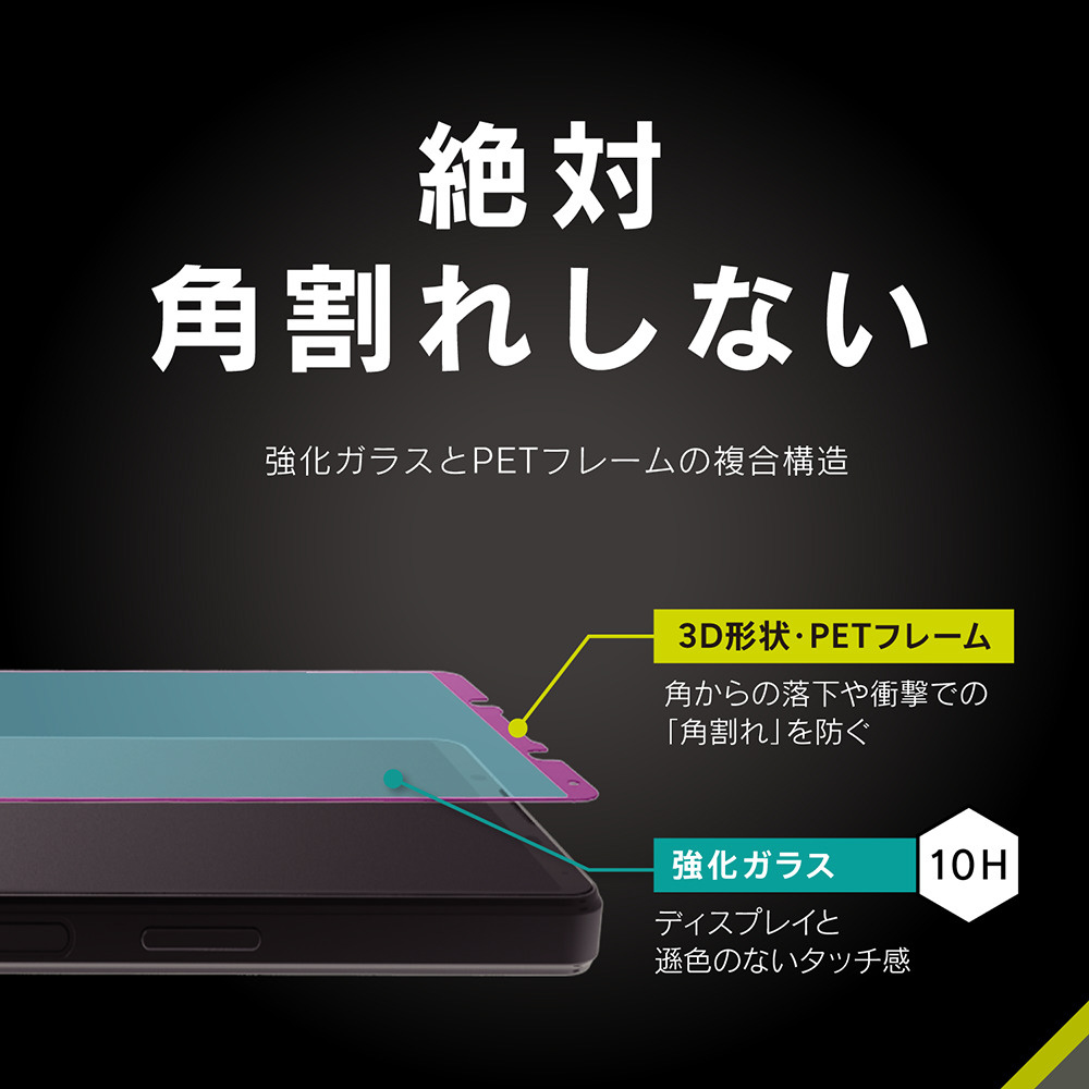 ・角割れしない。強化ガラスとPETフレームの複合構造
