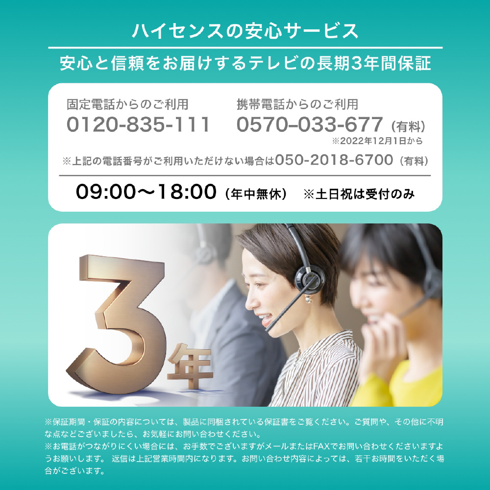 お客様に安心して製品をお使いいただけるよう、ハイセンステレビ製品には3年保証が付いています。