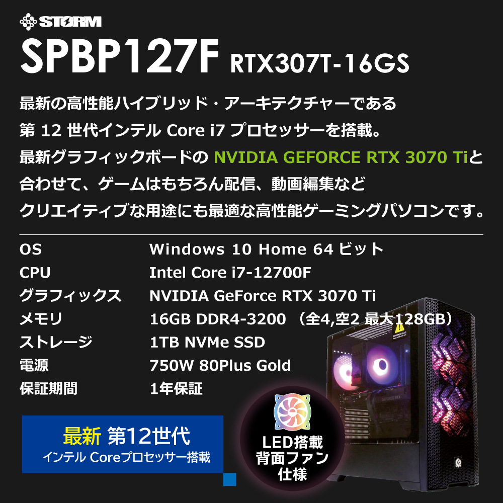 ゲーミングデスクトップパソコン SPBP127FRTX307T-16GS [モニター無し /intel Core i7 /メモリ:16GB /SSD:1TB /RTX 3070Ti]