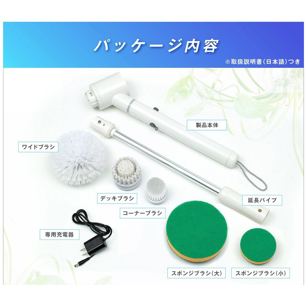 充電式コードレス 耐水両回転ブラシ。IPX7相当の耐水性で水回りも安心。ワイドブラシとデッキブラシは双方向に回転する構造でブレずに安定して汚れをかきだします。