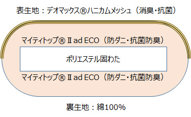 表面の生地に瞬間消臭素材で綿混ハニカムメッシュの「デオマックス(R)」を使用。中わたは防ダニ・抗菌防臭素材で大変衛生的な敷ふとんです。