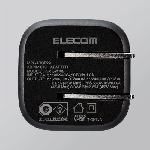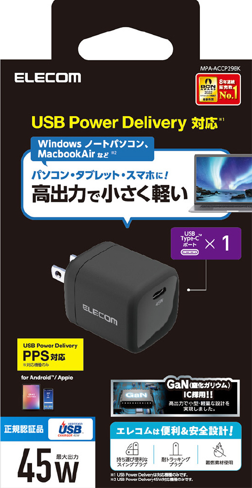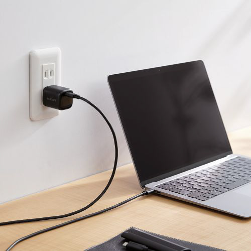 USB Type-C(TM)ポートを1ポート搭載し、GaN(窒化ガリウム)を採用した小型で軽量、かつ高出力なUSB AC充電器です。USB Power Deliveryに対応し対応するノートパソコンやスマートフォン、タブレットなどを超高速充電が可能です。本製品のUSB Power Delivery最大出力は45Wです。PPSに対応する機器の場合には端末に最適な出力で効率的に電源を供給できます。