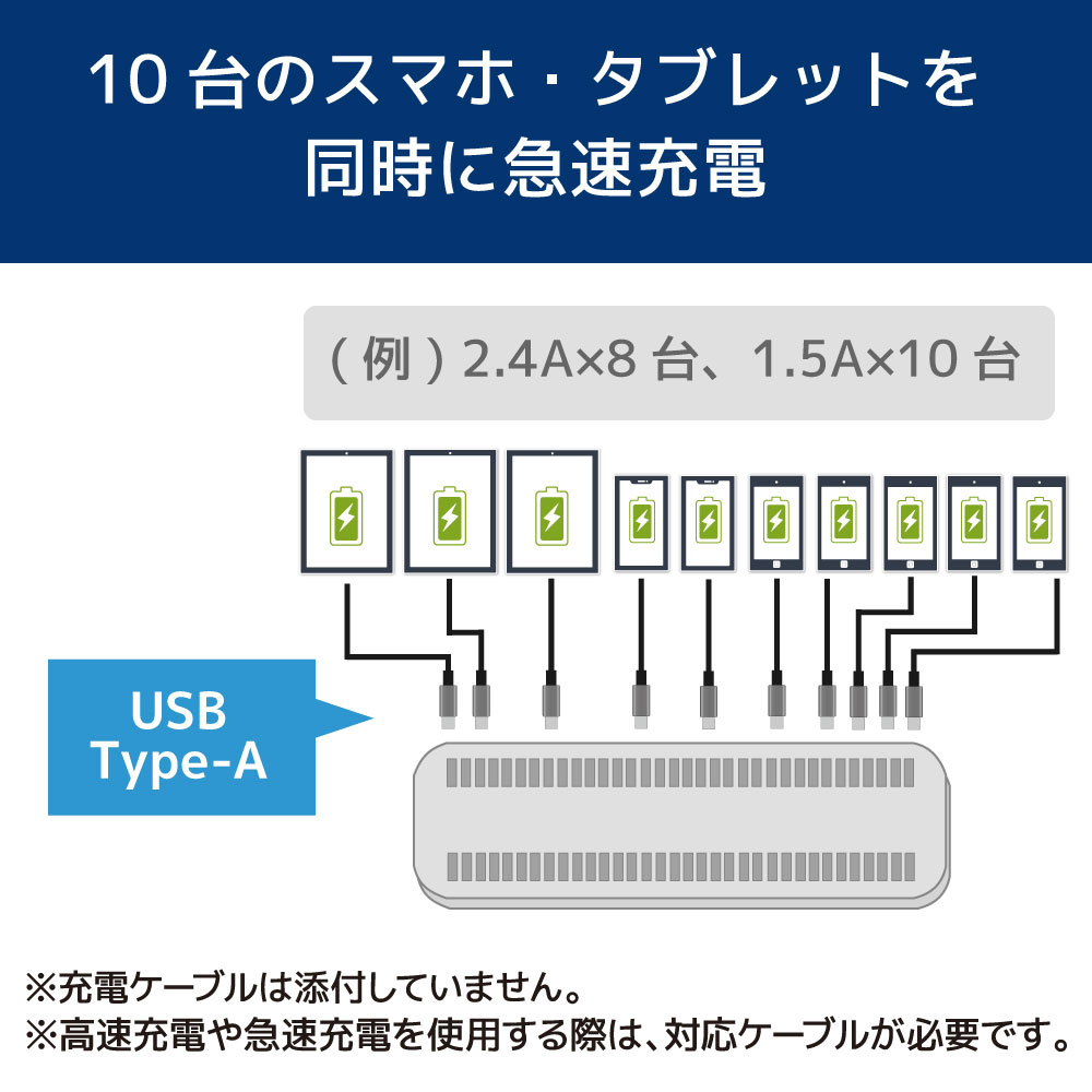 | 商品名 | AC - USB充電器 タブレット・スマホ対応 19.2A 各2.4A [10ポート:USB-A] RS-USBCS10 |