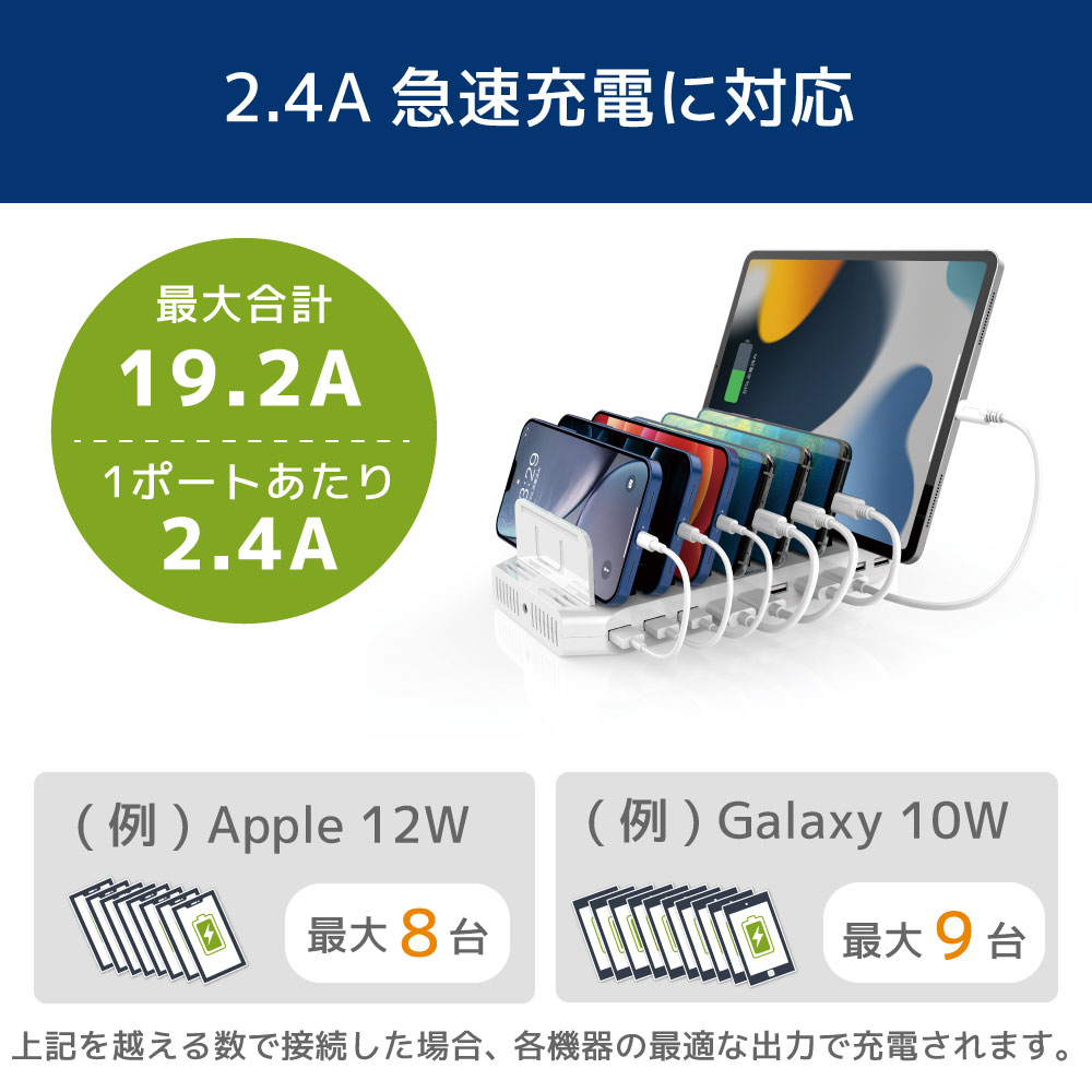 ■接続台数の目安:Apple 12W 高速充電 8 台まで Galaxy 10W 急速充電 9 台まで