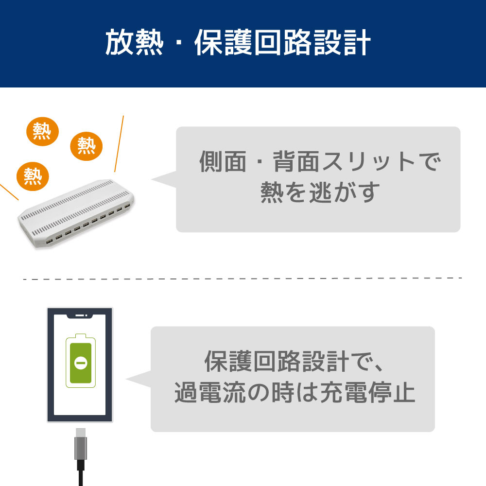 | 仕様1 | [対応機器] iPhone、iPad、スマートフォン、タブレット、USB充電対応の機器 [USBポート数]USB Type-A×10ポート [定格入力]AC100V 50/60Hz [定格出力]最大5V/19.2A(10ポート合計最大)、最大5V/2.4A(1ポートあたり最大) ※接続した機器に合わせて出力します。Apple 12W、Galaxy 10W、USB BC 1.2(7.5W)に対応。 [合計最大出力]96W(理論値) |