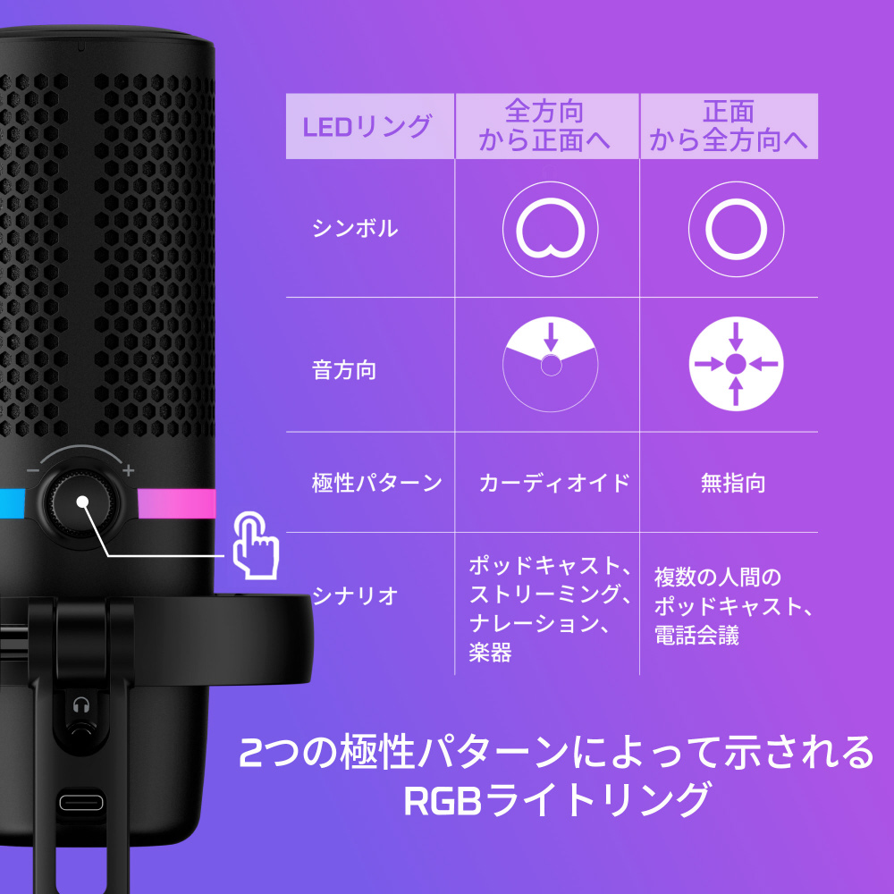 エレガントなデザイン、薄型のショックマウント、カスタマイズ可能なRGBライトリングを備えたHyperX DuoCastは、ゲーム、作業、コンテンツ作成用など、フル機能のUSBマイクとなります。タップするだけでミュートでき、ブロードキャスト中の気まずいミスを避けることができます。耐衝撃マウントを搭載されており、衝撃音を抑えられます。PC、PS5、PS4、Macと互換性があり、付属のアダプターは多くのマウントに対応できます。