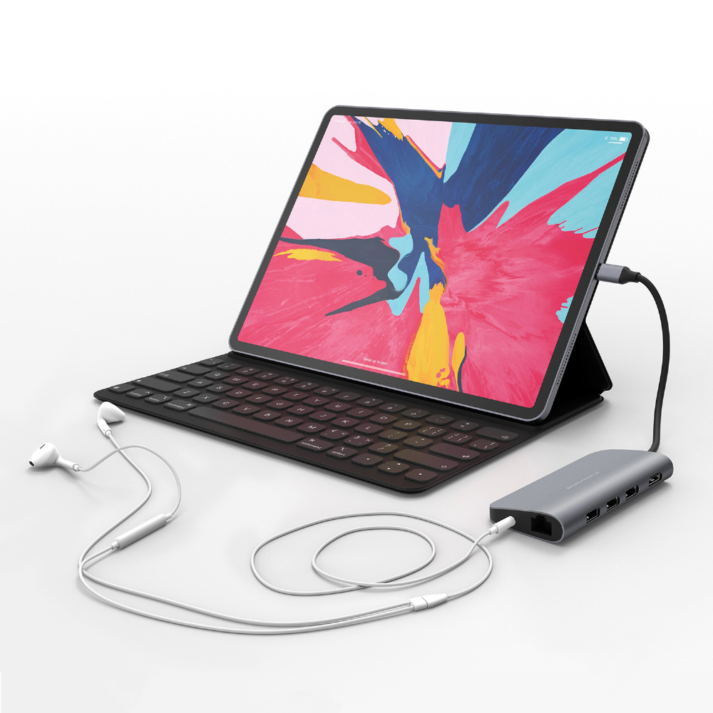 iPad ProのCタイプにつなぐ際もハブ本体が浮かずテーブルに乗せられる長さのケーブルを採用しており、PCやMacBookだけではなく、iPad Proにも快適に使うことができます。
