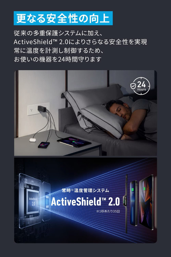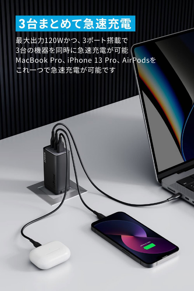 独自技術GaNPrime採用で3台同時急速充電が可能 最大120W出力のコンパクトUSB急速充電器。Anker独自技術「GaNPrime」を採用し、GaN搭載充電器が前シリーズから進化。