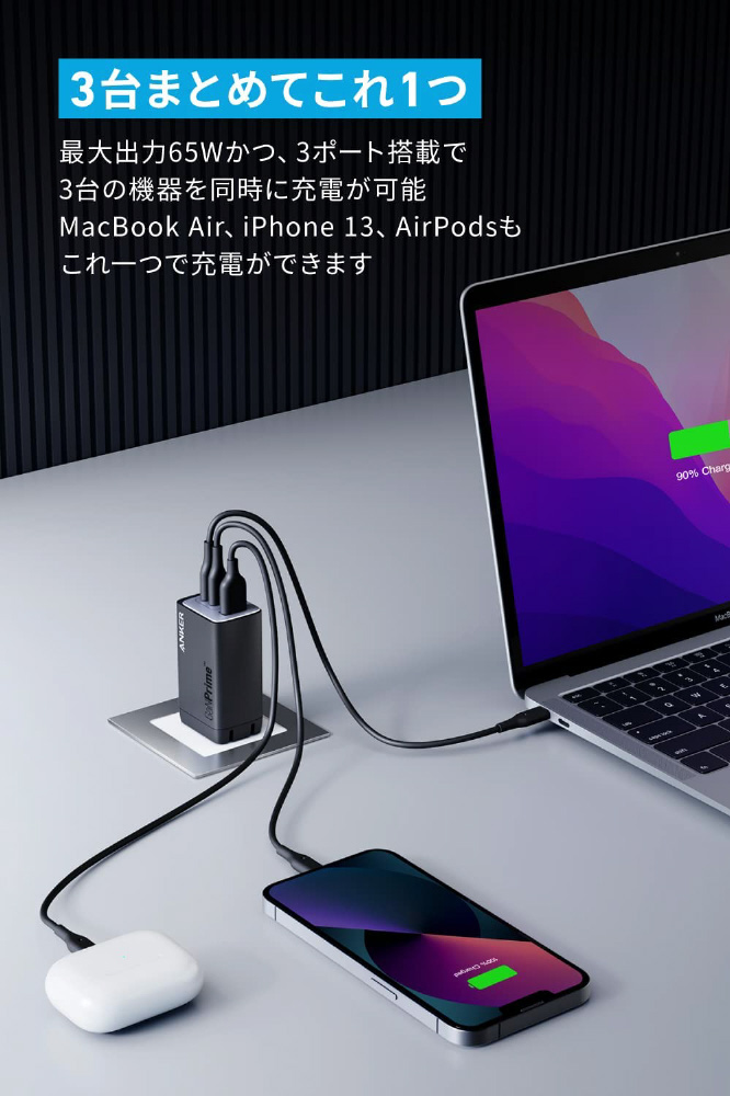 独自技術GaNPrime採用で3台同時急速充電が可能 最大65W出力のコンパクトUSB急速充電器。nker独自技術「GaNPrime」を採用し、GaN搭載充電器が前シリーズから進化。