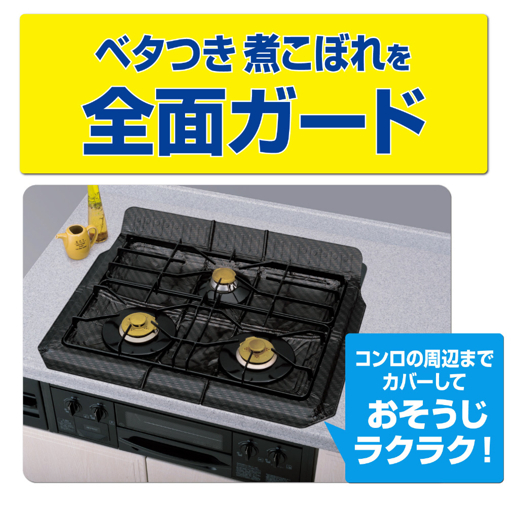 1枚で、コンロ全面を覆えるのだけでなく、排気口や縁まで覆えます。 煮こぼれや油はねなどをしっかりキャッチします。