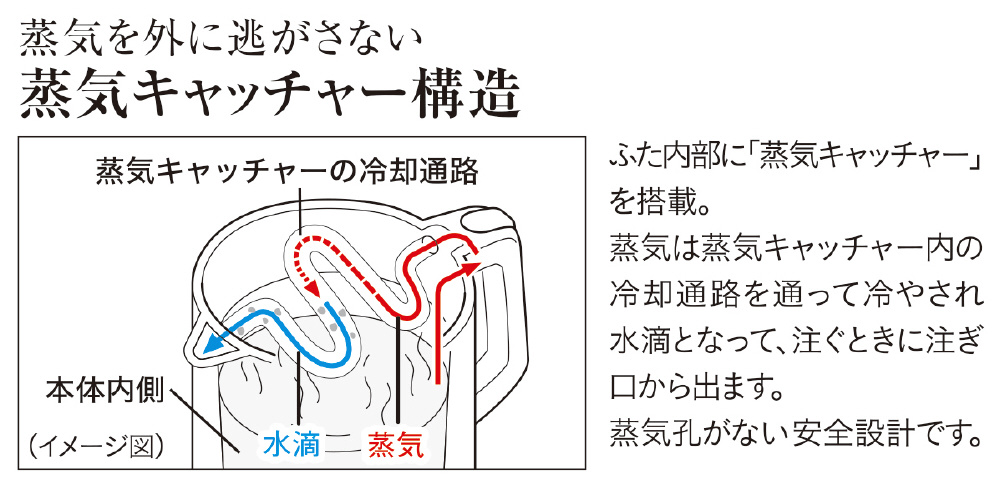 ふた内部に蒸気キャッチャー構造を搭載。蒸気孔から出る高温の蒸気にふれてやけどをするおそれがありません。