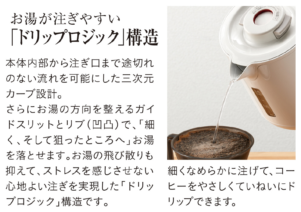 樹脂製の二重構造で、本体が熱くなりにくい設計です。沸かしたお湯も冷めにくく保温性にもすぐれています。