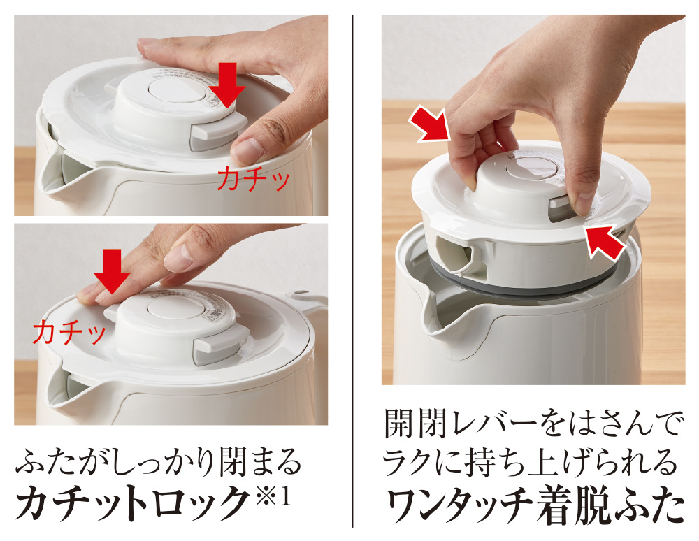 注ぐときは給湯ロックボタンを押すだけ。片手でらくらく操作できます。ロックしておけば万一倒れても注ぎ口からのお湯もれをおさえます。