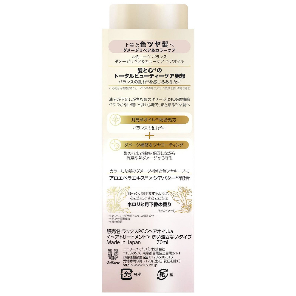 | 商品名 | LUX(ラックス)ルミニーク バランス ダメージリペア&カラーケア ヘアオイル 70mL 【864】 |