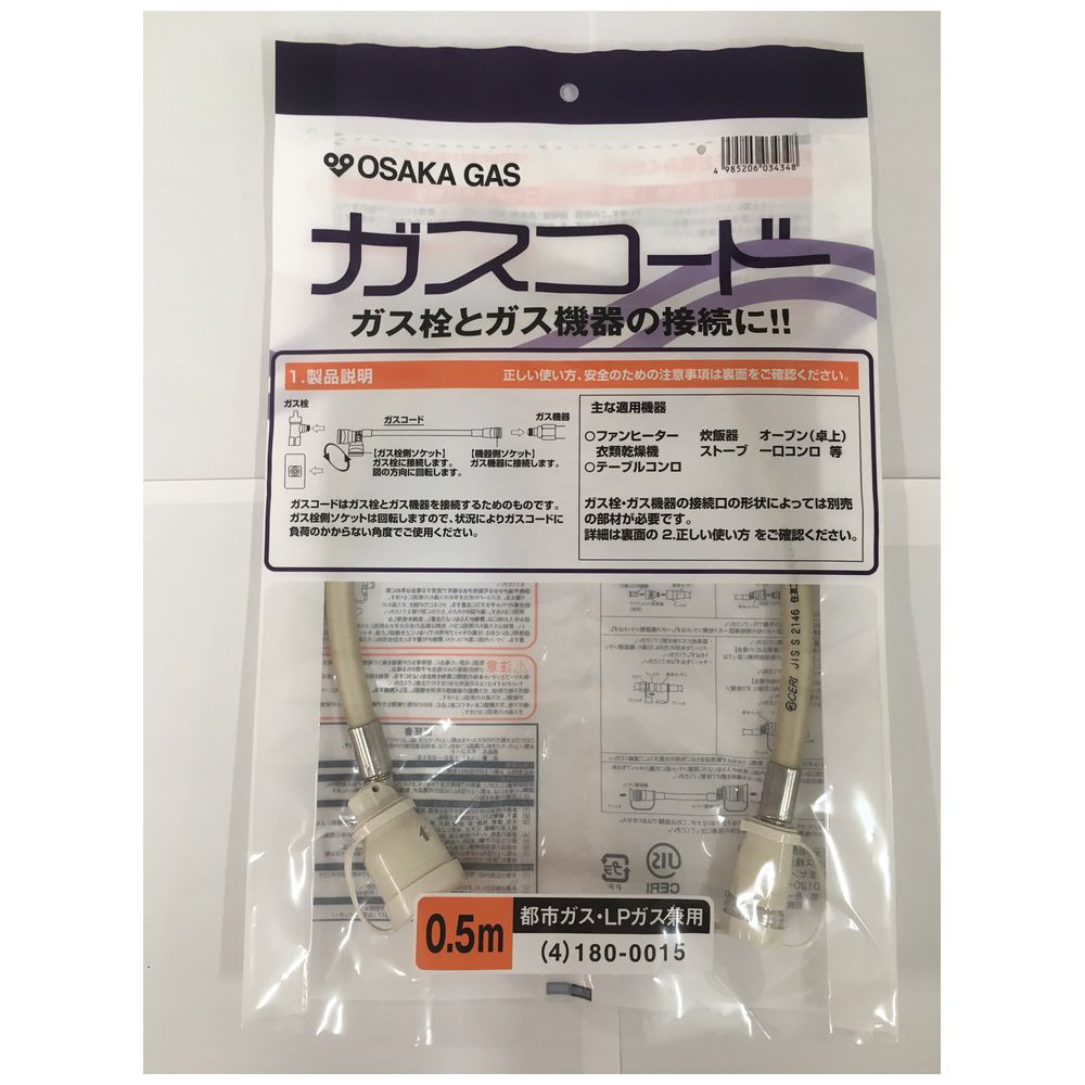 都市ガス(13A)・プロパンガス(LP)兼用ガスコード 長さ0.5m 4-180-0015