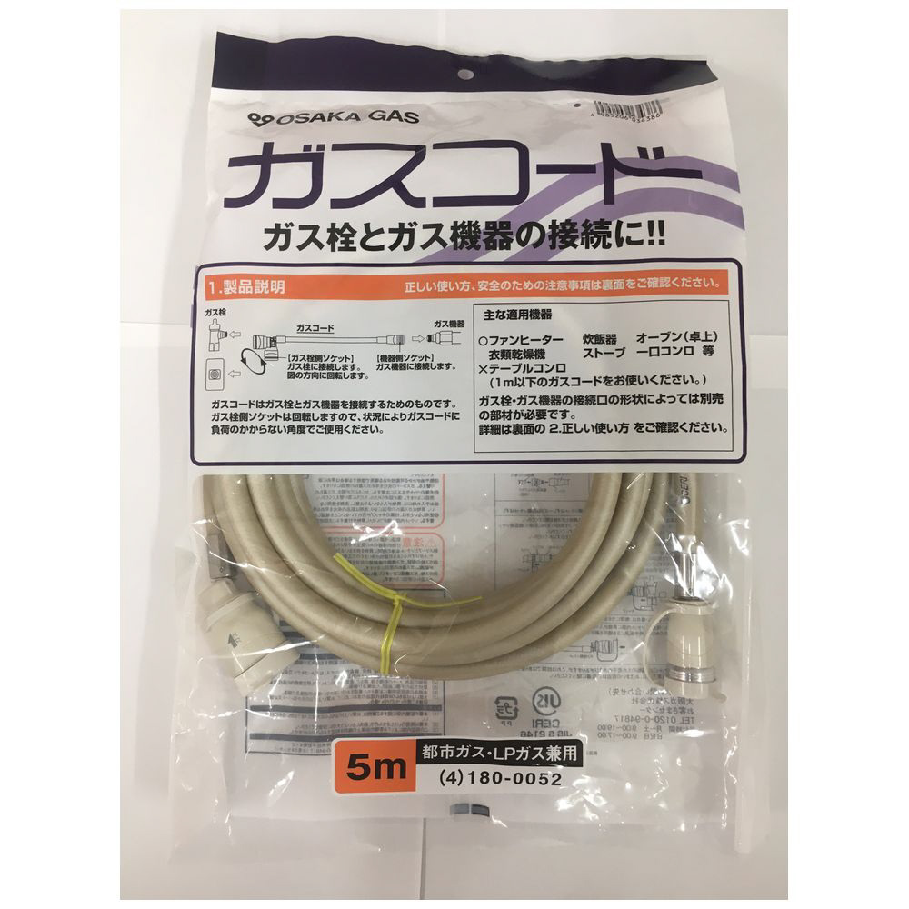 都市ガス(13A)・プロパンガス(LP)兼用ガスコード 長さ5.0m 4-180-0052