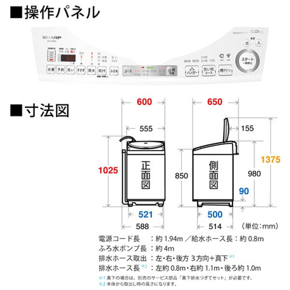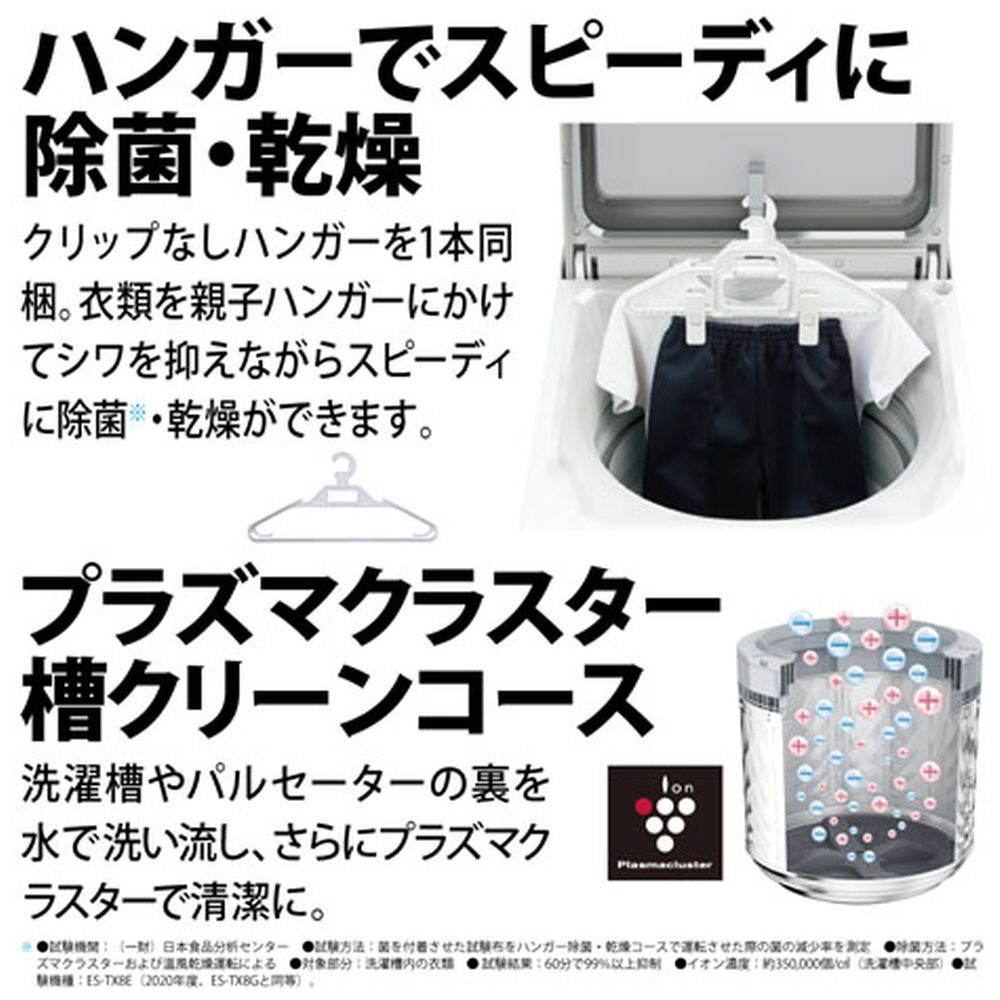 | 商品名 | 縦型乾燥洗濯機 ホワイト系 ES-TX8G-W [洗濯8.0kg /乾燥4.5kg /ヒーター乾燥(排気タイプ) /上開き] |