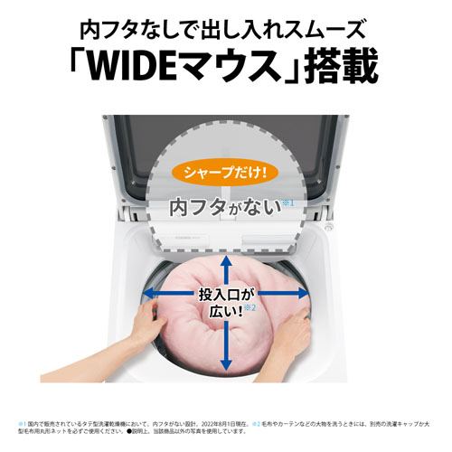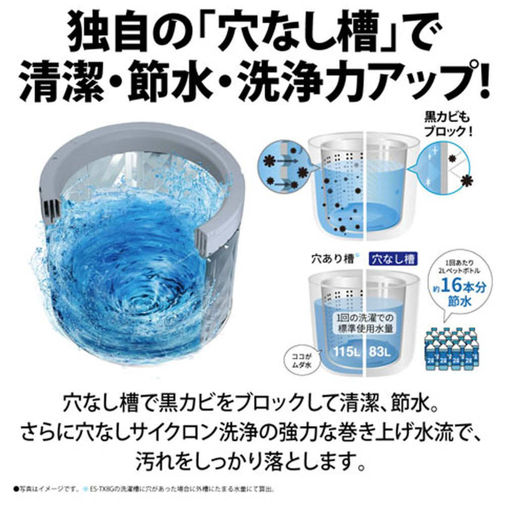 シャープの縦型洗濯機ES-TX8G-Wは穴が無いから無駄水カット。穴が無いから巻き上げ水流ドルフィンファン搭載したモデル。