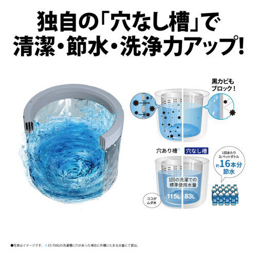 穴なし槽で黒カビをブロックして清潔、節水。さらに穴なしサイクロン洗浄の強力な巻き上げ水流で、汚れをしっかり落とします。