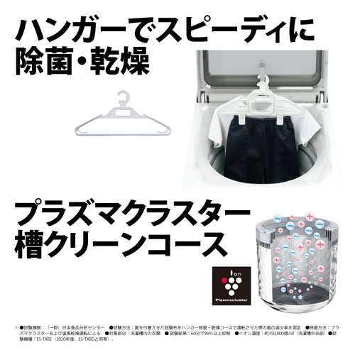 クリップつきのハンガーを1本同梱。衣類を親子ハンガーにかけてシワを抑えながらスピーディに除菌・乾燥ができます。また、洗濯槽やパルセーターの裏を水で洗い流し、プラズマクラスターで清潔に保ちます。