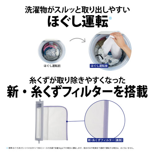 脱水の最後にパルセーターを動かして洗濯物の絡みをほぐすので、洗濯物がより取出しやすくなります。また、水流にのった糸くずを袋状のフィルターでしっかりキャッチ。裏側の布端にあて布を被せることで、糸くずが取り除きやすくなりました。