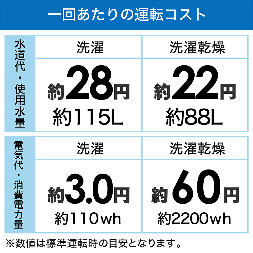| 消費電力量 | 110Wh/2200Wh(洗濯/洗濯〜乾燥) |