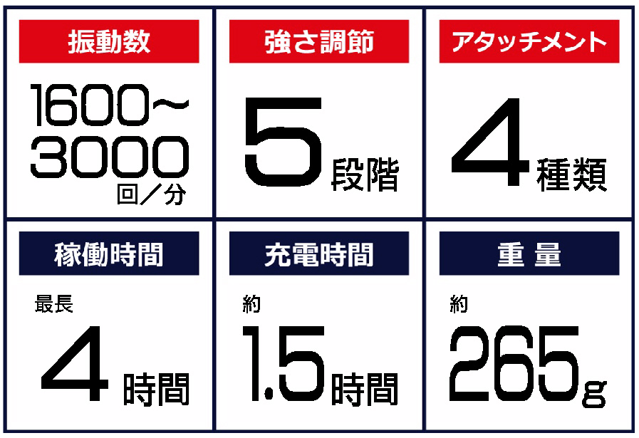 | 付属品 | アタッチメント×4種類 ・アタッチメント用ストッパーゴム(予備)×1 ・充電用USBコード ×1 ・取扱説明書 ×1 ・収納ケース ×1 |