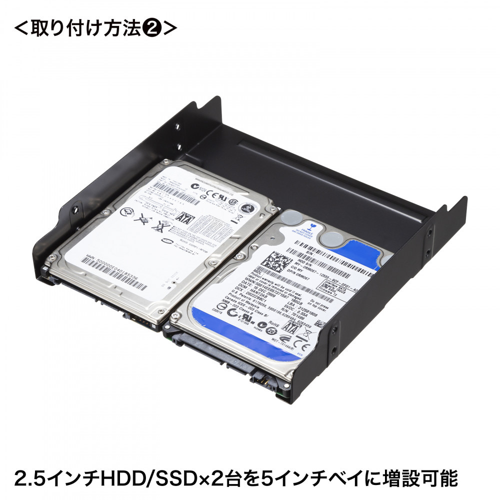 5インチベイに2.5インチSSD/HDDを2台、または3.5インチHDDを1台取り付けできる変換マウンタ。