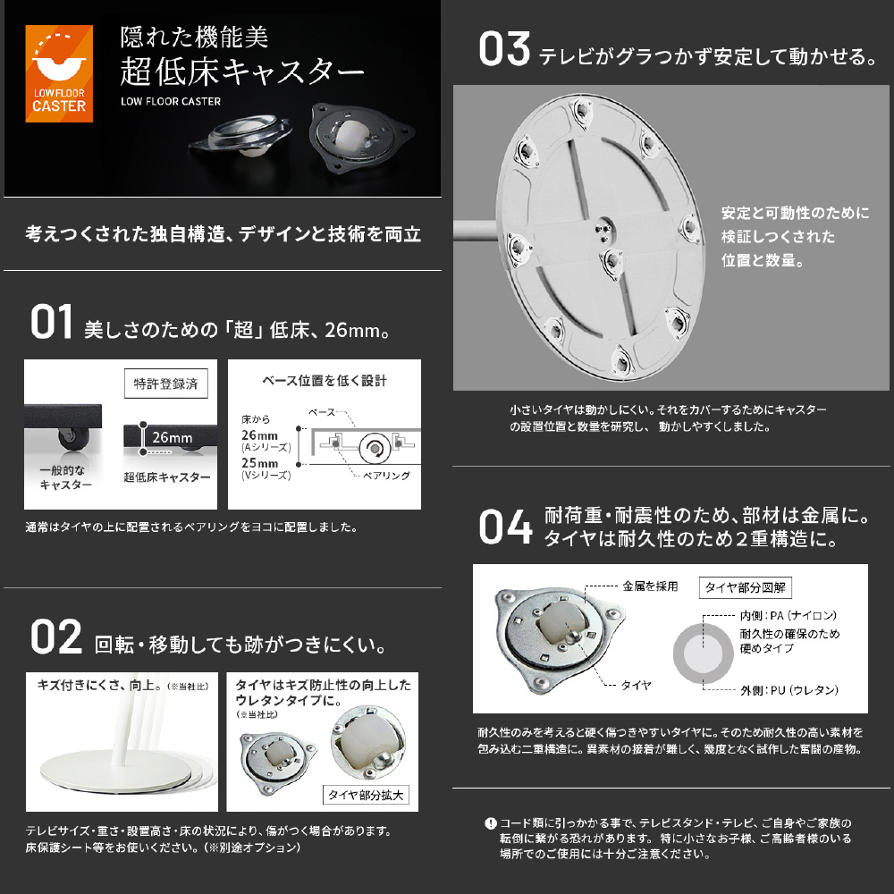 独自開発した低床キャスターをベースの裏側にバランスよく9個配置。荷重が分散されるのでスムーズに動かせます。少し近づけて視聴したい時、テレビの向きを変えたい時、お掃除の際に少し移動させたい時などとても便利。