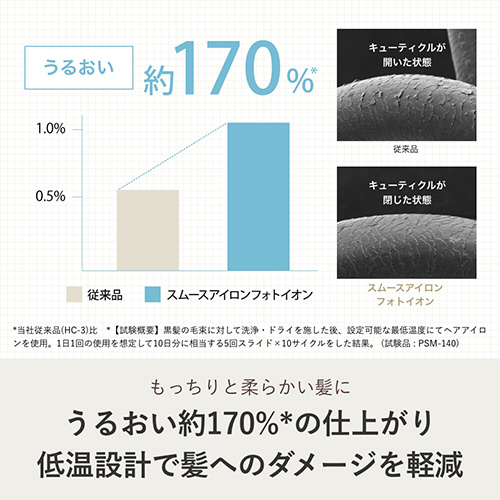 美顔器発想のテクノロジー「モイスチャーパルス」を搭載。低温設計で髪のうるおいを保ち、ダメージを低減しながらスタイリング。プロの仕上がりを再現した独自のヒートセンシングテクノロジーにより、滑らせるだけでツヤとまとまりのある髪へと導きます。