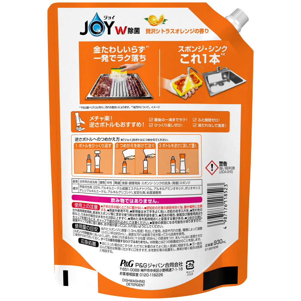 | 商品名 | JOY 除菌ジョイコンパクト つめかえ用 超特大 930mL 贅沢シトラスオレンジの香り |