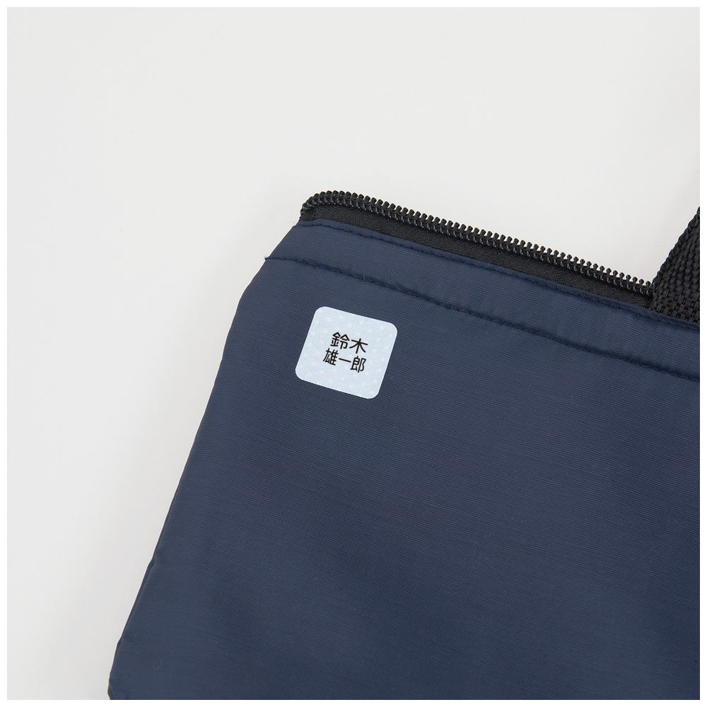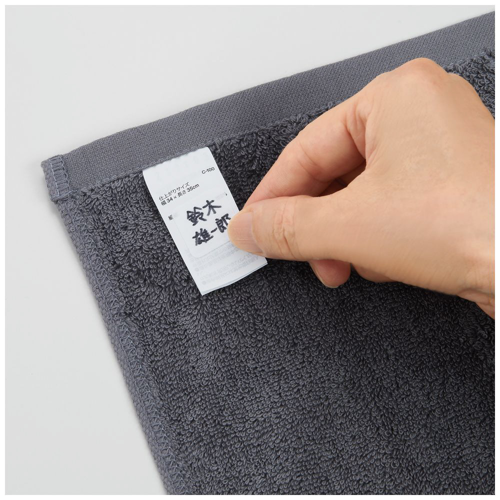 油性ペンやどこでも持ち物スタンプで名前を書き、指で強く押して貼るだけで名前付けができます。にじみ防止加工済みです。