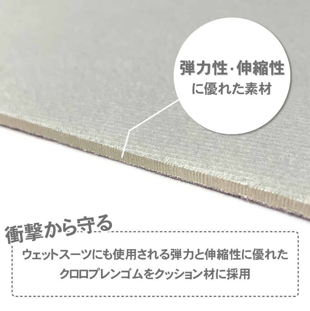 ウェットスーツなどにも使用される、弾力性と伸縮性に優れたクロロプレンゴムをクッション材に採用しています。しっかりとしたクッション材が大切なノートPCを傷や衝撃から保護します。