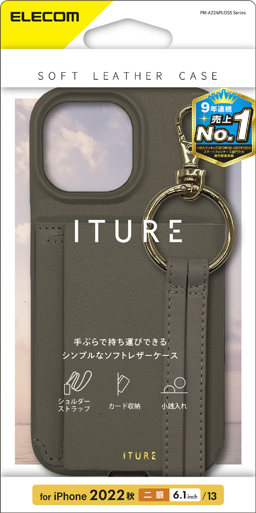 持ち運びに便利なショルダーストラップとコインケース、カードポケットもついたマルチに活躍するiPhone 14、iPhone 13用ソフトレザーケースです。